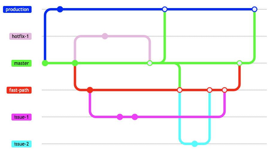 週次リリースしてよい機能の開発は、fast-pathブランチから作業ブランチを作成しコード変更とレビューが終わればfast-pathにマージします。 毎週水曜日の段階でfast-pathブランチに未リリース分があれば、masterブランチ → productionブランチの順でマージを行いリリースします。